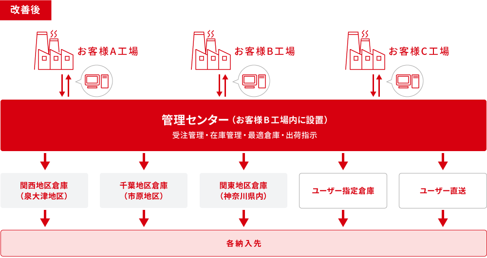 - 3地区(大阪・千葉・神奈川)に倉庫を集約したことで、在庫の大幅削減(適正在庫)が図れた