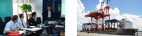 (左)お客様との打ち合わせ(右)ガントリークレーンの海上輸送